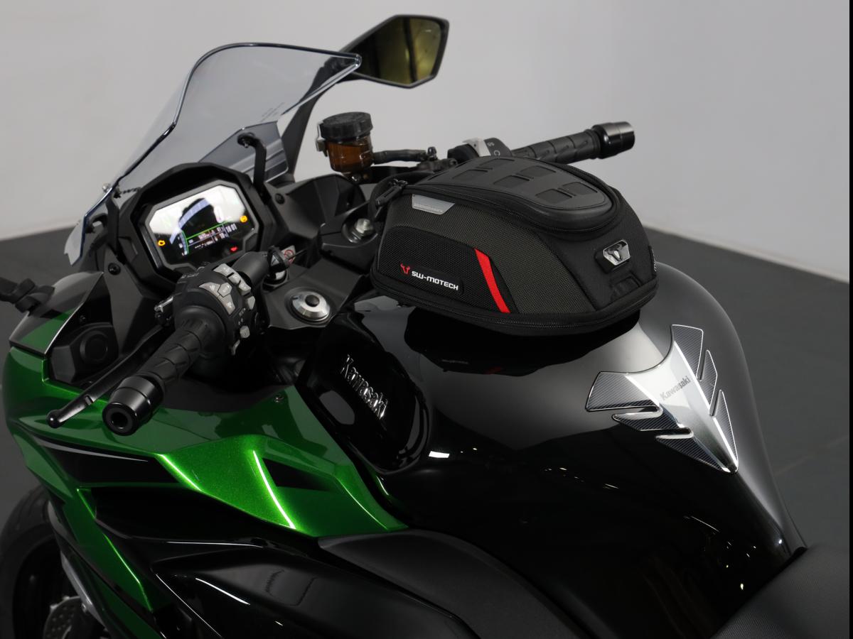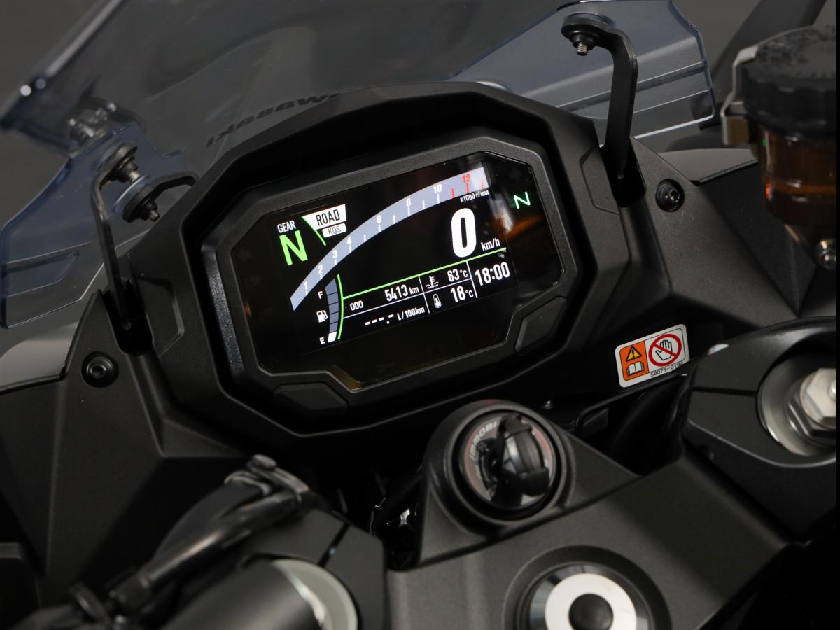 La position tout comme l’agrément de conduite est parfaite. Cette moto est faite pour absorber des kilomètres en linge droite sur autoroute grâce à son régulateur de vitesse, son guidon qui ne vous casse pas les poignées et à sa bulle qui vous protège bien du vent. Elle sait aussi se montrer particulièrement à l’aise dans un col. Son châssis en alu la rend très agile et son moteur 4 cylindres 1000 cm3 accélère fort, très fort. Les assistances électroniques sont là pour assurer votre sécurité dans toutes les conditions.